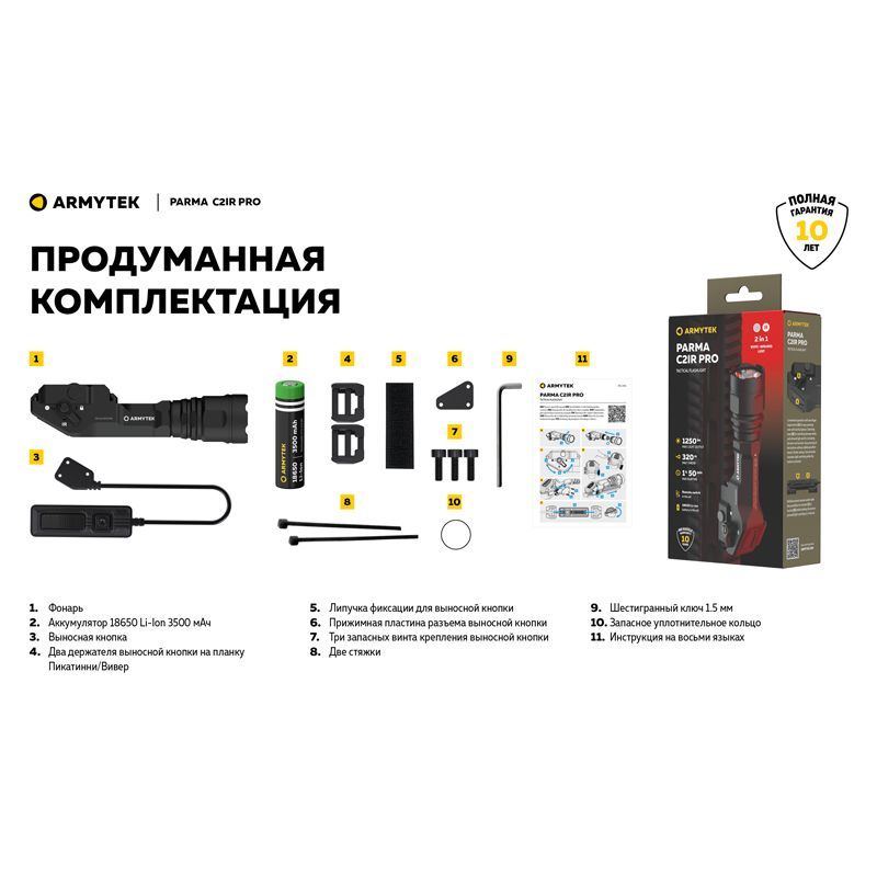 Комплектация: аккумулятор 18650 Li-Ion 3500 мАч, выносная кнопка, два держателя выносной кнопки на планку Пикатинни и Вивер, липучка фиксации для выносной кнопки, прижимная пластина разьема выносной кнопки, три запасных винта крепления выносной кнопки, две стяжки, шестигранный ключ 1.5 мм, запасное уплотнительное кольцо.