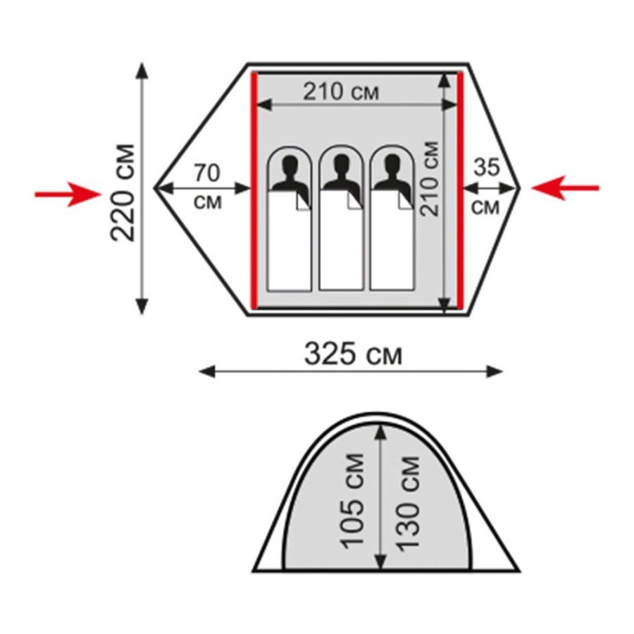Размер внутренней палатки ДхШхВ, см: 210 х 210 х 105