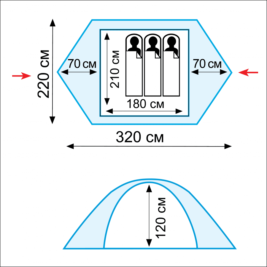 Размер внутренней палатки ДхШхВ, см: 210 х 180 х 120