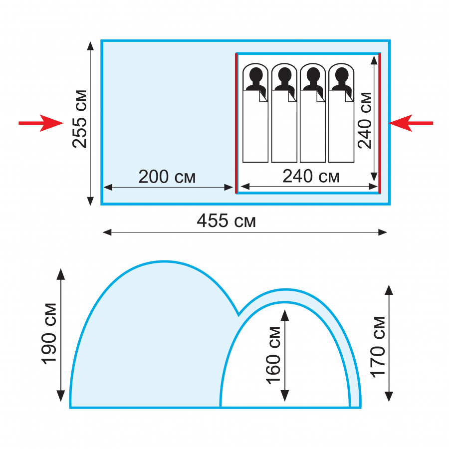 Размер внутренней палатки ДхШхВ, см: 240 х 240 х 160