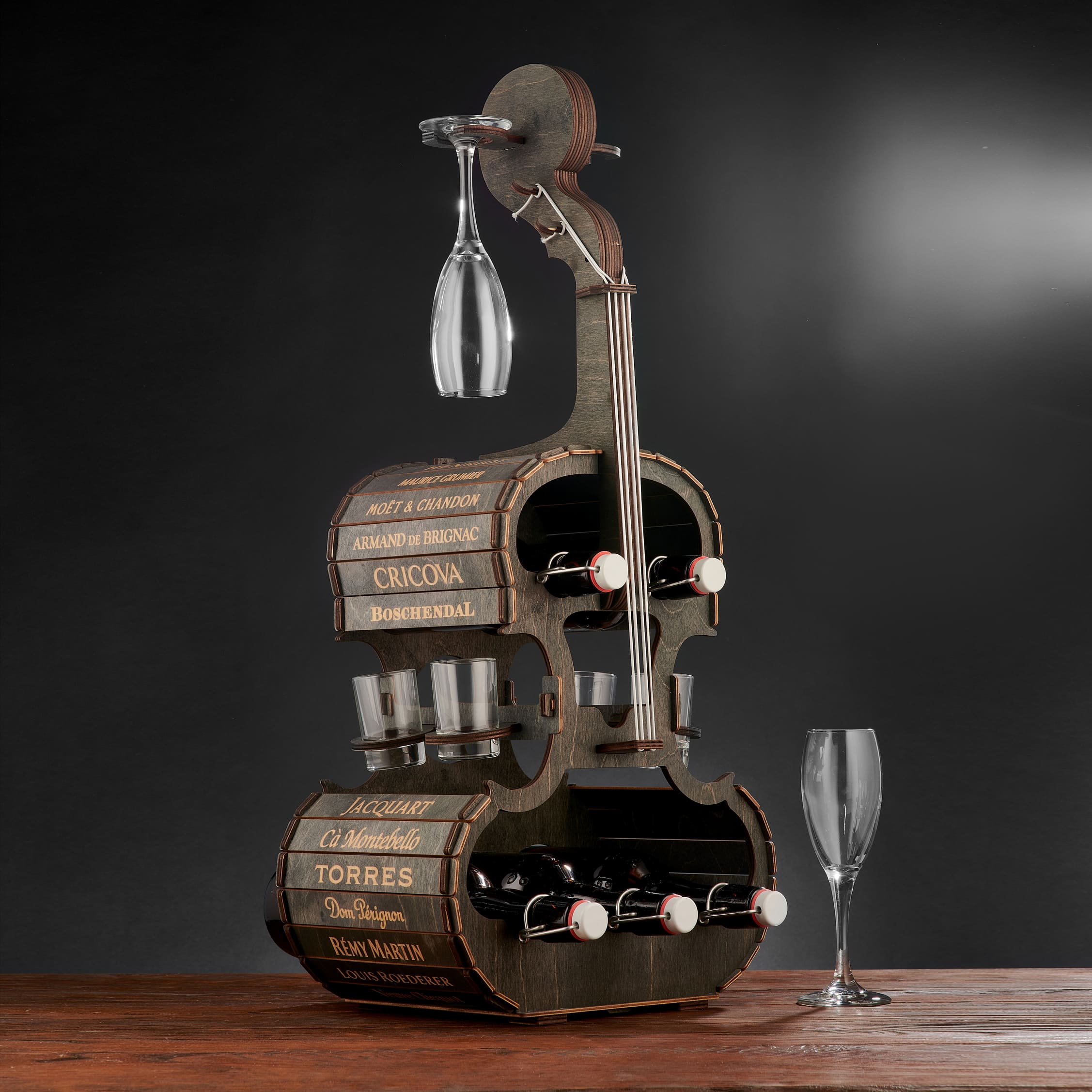 Подарок - Виолончель-бар! Мини бар - это оригинальный подарок, который оценит любой человек. Вместительный - с лёгкостью можно разместить в нем до 5 бутылок любимого напитка, презентабельный, а так же отличное качество. Прочная и устойчивая конструкция. Все детали вырезаны лазером из натурального дерева, а само изделие имеет приятный цвет венге. Мини-бар Виолончель отлично подойдёт для украшения банкетного стола и станет приятным глазу элементом в интерьере любого помещения. Также такой набор может послужить хорошим и практичным подарком для близких и друзей.
