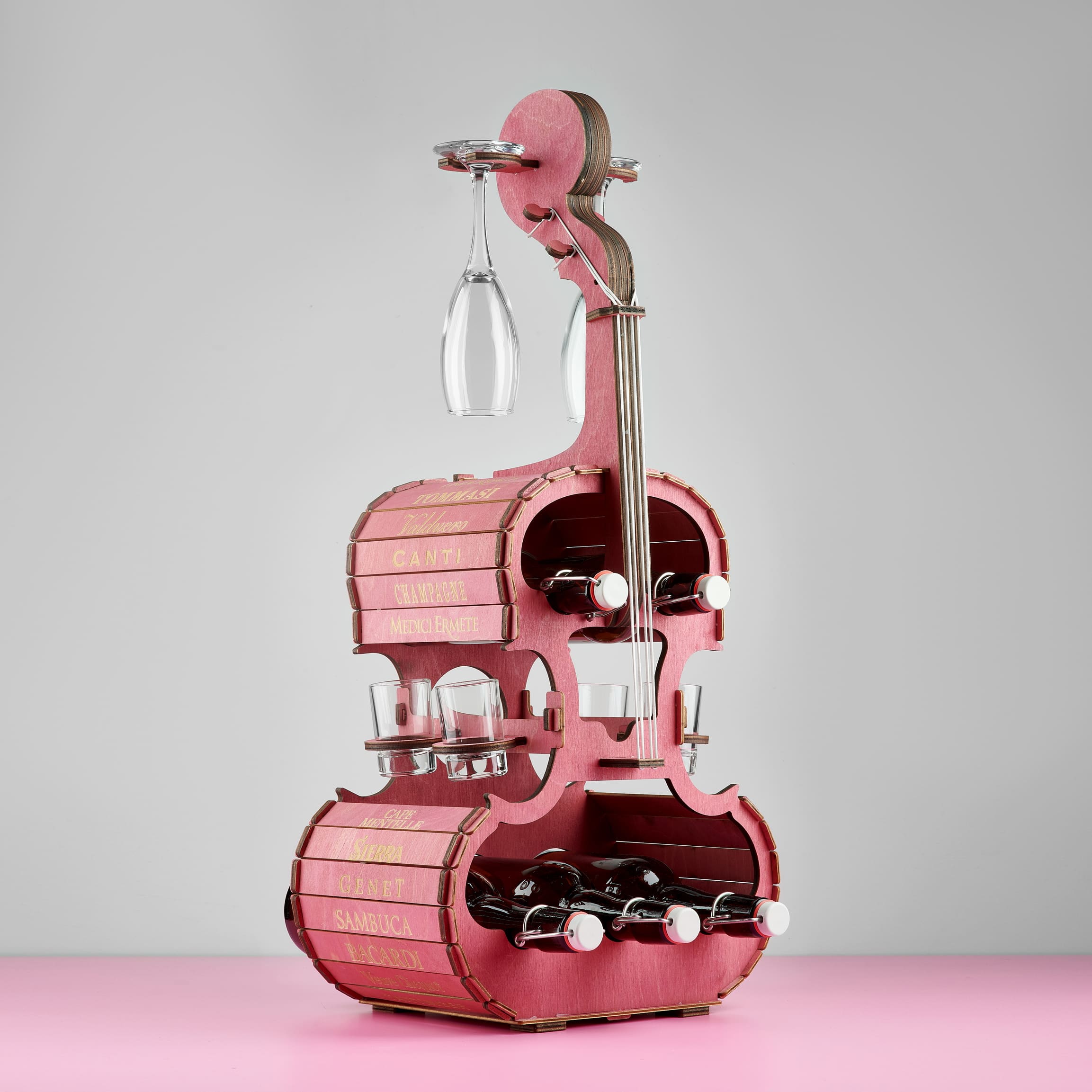 Подарок - Виолончель-бар! Мини бар - это оригинальный подарок, который оценит любой человек. Вместительный - с лёгкостью можно разместить в нем до 5 бутылок любимого напитка, презентабельный, а так же отличное качество. Прочная и устойчивая конструкция. Все детали вырезаны лазером из натурального дерева, а само изделие имеет приятный цвет венге. Мини-бар Виолончель отлично подойдёт для украшения банкетного стола и станет приятным глазу элементом в интерьере любого помещения. Также такой набор может послужить хорошим и практичным подарком для близких и друзей.